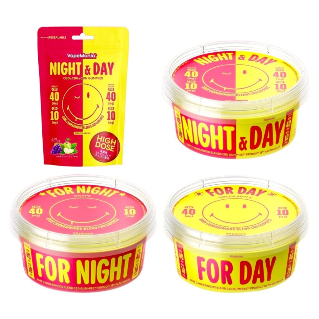 CBD専門店VapeManiaが手がける「オリジナル レアカンナビノイドグミ」は、CBD・CBN・CBGを用途に合わせて配合した注目のエディブルです。昼用(DAY)と夜用(NIGHT)に分かれており、シーンごとに最適なカンナビノイドを選べるのが特徴です。